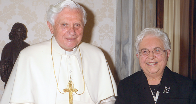 « En 2008, il nous a reçus, le Coprésident Faletti et moi, immédiatement après l’Assemblée Générale du mouvement des Focolari à laquelle nous avions été élus, la première élection après la mort de notre fondatrice. Il m’a ensuite invitée, voyageant dans le même train que lui avec de nombreuses autres personnalités, à la ‘Journée de réflexion, de dialogue et de prière pour la paix et la justice dans le monde‘ qui s’est tenue à Assise le 27 octobre 2011, 25 ans après la première journée organisée par le pape Jean-Paul II en 1986. Enfin, j’ai assisté à sa dernière audience le 27 février 2013 après l’annonce de sa démission ».