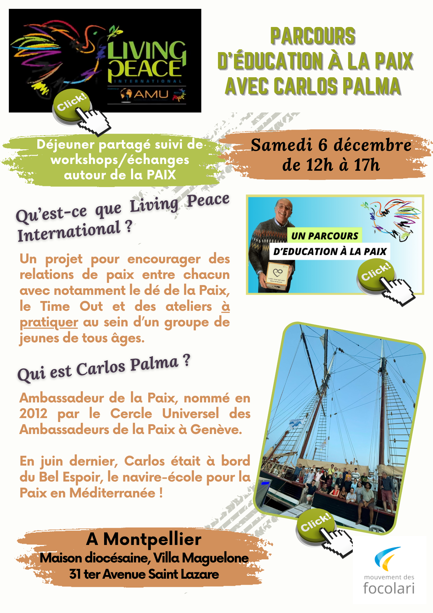 Enfin, Carlos Palma s’adressera à des aumôneries d’étudiants à Marseille et à Montpellier car « Living Peace » s’étend jusqu’aux universitaires.