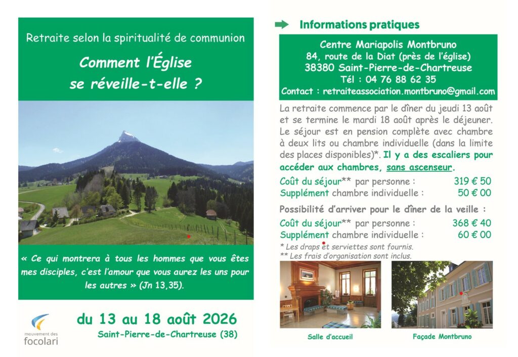 Accueil / Evénements Retraite d’été du Jeudi 13/08/2026 au Mardi 18/08/2026 Lieu : St Pierre de ChartreuseOrganisé par :Centre Mariapolis Saint Pierre de Chartreuse Mail : association.montbruno@focolari.fr Tél : 04 76 88 62 35 Site web : https://www.centremariapolis-chartreuse.fr/ Retraite selon la spiritualité de communion “Comment l’Eglise se réveille-t-elle ?”
