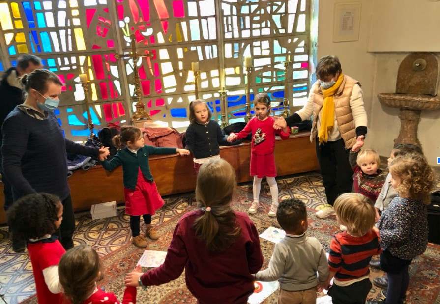 La sacristie est mise à disposition où pour se préparer à Noël et devenir des semeurs de lumière, notre groupe Gen4, rejoint par 2 enfants de la paroisse, découvre le dé de l’Amour, chante, partage et réalise un beau dessin sur la vie de Jésus. Que c’est beau de les voir, autour d’une bougie allumée, prier le Notre Père !