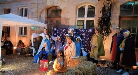 Dans la cour, tous les trois quarts d’heure, se déroulaient une crèche vivante, avec la participation de jeunes scouts et de différentes personnes d’une paroisse de Strasbourg. Ils étaient accompagnés par un chœur scout, chantant des chants de Noël, que la foule reprenait, créant ainsi une belle atmosphère de joie et sérénité. Un bon vin chaud était aussi proposé à qui se trouvait dans la cour.