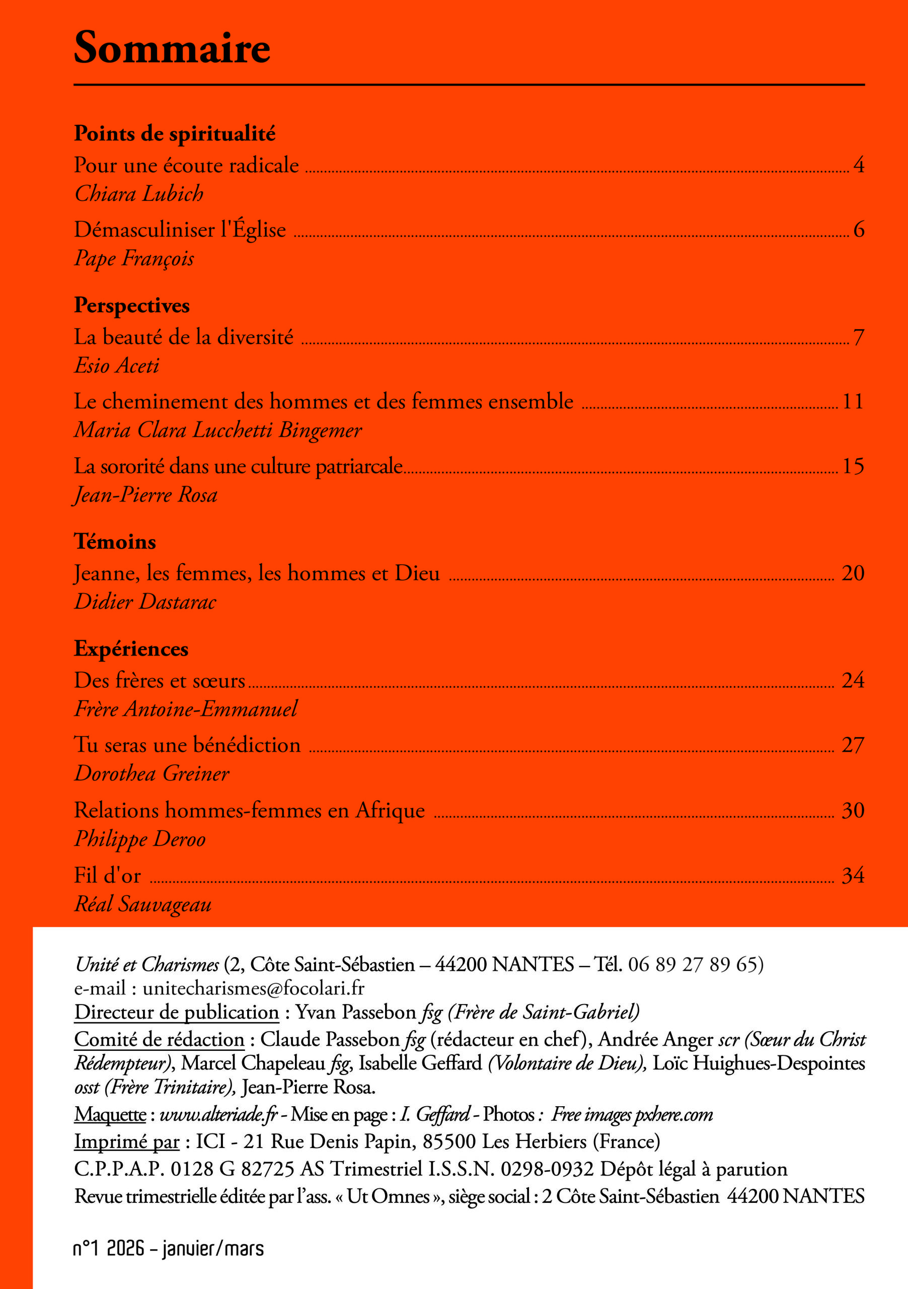 Revue de spiritualité de communion.Unité et Charismes est une revue trimestrielle. Elle vise à mettre à la disposition de tous les dons que l’Esprit a offerts et continue d’offrir à l’Église et au monde au cours des siècles, à travers les saints. Elle emboîte le pas à Ekklesia, l’une des revues du mouvement des Focolari fondé par Chiara Lubich, sous forme numérique ou imprimée. Elle est traduite en différentes langues à partir de l’édition italienne et propose à ses lecteurs la richesse spirituelle et humaine de ce nouveau charisme.
